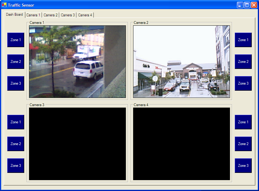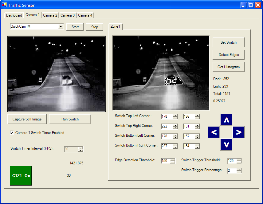 This application, developed in C# takes video feeds from four cameras at an intersection and determines whether or not vehicles are present in the user definable switch regions.